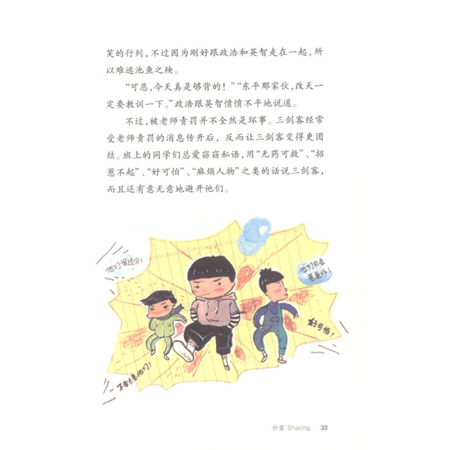 阳光透过银杏树叶的缝隙星星点点地洒落下来。树丫上的银杏叶随着风 吹的方向,胡乱地摇摆不停。尚宇跟政浩还有英智一起坐在长椅上,无所事事地望着操场的方向。班 上的同学们正在踢足球。只要说到足球,连在睡梦中也会立刻跳起来的英智,今天不知道是怎么一回事,频频注意着尚宇的脸色。“真的好烦哟!”尚宇说完便往地上吐了一口唾沫。旁边的政浩笑着转过头来看着尚宇说道:“你刚才打架的时候蛮厉害的 嘛!明雄那小子,听说是跆拳道二段,今天他可是形象全毁啦!”尚宇本来想说什么的,但还是决定不说了。虽然他狠狠地扁了一顿老爱 缠着小如的明雄那家伙,可是心情还是不怎么好。政浩自顾自地继续说下去:“小如她真的也很奇怪呀!人家好心帮她,她好歹也该说一声谢谢,干吗要对你发脾气啊?女生实在是很难伺候!”事实上,尚宇就是在气这件事。尚宇跟明雄打架不过是刚才发生的事,但其实从早上开始,尚宇就有一 种不好的预感。明雄从早上自习开始,就一直不停地围着小如打转。如果有 人说导火线是因为小如穿了一条漂亮的裙子来上学,一点也不为过。“哇,洪小如,你今天真的好像电影明星哟!”一见小如走进教室,眼 尖的明雄就开口说了一句。那句话究竟是称赞还是嘲讽,没有人知道。可是 每到休息时间,他就挨到小如的旁边闹个不停地说:“怎么穿成这样,你又 不是什么大明星!你怎么不到电视台去,跑来学校做什么啊?”小如则不甘示弱地顶回去:“不干你的事,我是穿裙子还是穿裤子不用 你管!”可是明雄还是不停地闹她。“我是因为觉得欺负小如很有趣才来上学的!”明雄总爱这么说。这句 话隐隐透露出一种自我夸耀的傲慢心态。换句话说,明雄总觉得自己是跆拳 道黑带二段,所以才有资格讲这种话。尚宇老觉得这样的明雄让人看了很不顺眼。打架事件发生在这天的午餐时间。小如在教室后面的树藤边跟其他的女 孩子一起玩耍,明雄突然走了过来,不怀好意地扯了扯小如的衣服。“你快点走开!再这样的话,我就去告诉老师哟!”“要告你就去告啊!我才不怕咧!我看你长得真像可爱的小狐狸……”当明雄的话说到这里,说时迟那时快,小如把手里的牛奶盒朝明雄的脸扔了 过去。牛奶盒不偏不倚地打中明雄的额头,然后掉到地上全都洒了出来。被 突发状况惊吓到的明雄,立刻气愤地抓住了小如的衣领。“臭女生!你居然敢向我丢牛奶盒!”明雄一副就要甩小如一记耳光的样子,尚宇正好在这个时间点出现,把 明雄抓着小如衣领的手推开。尚宇一开始并没有想要打架的意思,只是看到明雄做得太过分了,想过 来劝阻一下而已。可是被推开手臂的明雄冷不防地用头撞向尚宇,害尚宇抱 着肚子向后倒退了好几步。剎那间受到攻击的尚宇,立刻也采取进攻的姿势,当场飞身挥了一拳。拳头正中明雄的下巴,明雄被这一记打得整个人直接摔到地上。尚宇接着压 在明雄的肚子上,又狠狠地补了几拳。大概是觉得尚宇有点过分了,政浩和 英智急忙跑过来把两人拉开,然后这场好戏便不了了之。这时,小如气得朝尚宇大声斥责:“谁要你这么多管闲事啊?你跟明雄 一样,两个都是坏家伙!”听见小如的这番话,尚宇气愤地大声回了一句:“都是你爱招蜂引蝶,才会发生这件事的!”“你说什么?”小如一个箭步跑过来,用手掌大力地拍了一下尚宇的胸 口,“说话小心点!下次你再这样随便乱骂人试试看!”小如原本还想讲更无礼的话,不过还是很克制地把话吞下去。但她似乎 还是很气不过的样子,气呼呼地站了一会儿,然后快速地转身往教室跑去。尚宇用手揉了一下被小如用力拍过的胸口,其实,并不是因为痛。尚宇坐在长椅上,静静地望着秋季的天空。形状像巨大红豆饼的一朵白 云,飘啊飘地飘进尚宇的视野。“哼,感觉真差劲!”听到尚宇不高兴地碎碎念,政浩露出不解的表情:“你怎么了啊?刚才 你不是已经让明雄那家伙出洋相了吗?”“没什么,只是感觉怪怪的。”这回政浩转向英智问道:“为什么你的表情也看起来怪怪的啊?啊,你 跟明雄在同一个道馆上课对不对?你是不是担心下次去上课会被明雄打?”“才不是!”英智大惊失色地大叫。坦白说,英智因为还没有升到跆拳 道黑带,所以每天要在道馆跟明雄一起上课,他的确是有很大的压力。这时,午餐时间结束的钟声响起。尚宇一边意兴阑珊地往教室方向走着,一边对政浩跟英智说:“今天心情这么差,干脆等一下我们一起去不倒翁 小吃店,我请客。”不倒翁小吃店就在学校旁边。“太棒了,OK的啦!”政浩啪地弹了一下手指,大声地附和。英智倒是 没有表达任何的意见,默默地跟在尚宇后面。横穿操场的时候,尚宇隐约感受到某个人的目光,就在另一头的教务处 附近,香木树下有人往尚宇这边看过来。“喂,老人家!”政浩朝那个孩子大喊。那是俊宪。“老人家”是俊宪的绰号,不只是因为他说话慢条斯理,而 且他处事周全,加上个性沉稳,到现在为止从来不曾发过脾气,于是大家都 这么叫他。根据小道消息,他好像是有钱人家的独生子。和俊宪短暂的四目交会后,尚宇下意识地把头转向别的方向。像个小大 人似的沉稳老练,成绩一向都是班上第一名的俊宪,不知为什么就是让人觉 得有点不顺眼。尚宇和政浩、英智,放学后迫不及待地离开学校。像是刚从监狱逃出来 似的,三人争先恐后地拼命往前跑。学校前面的大马路上,