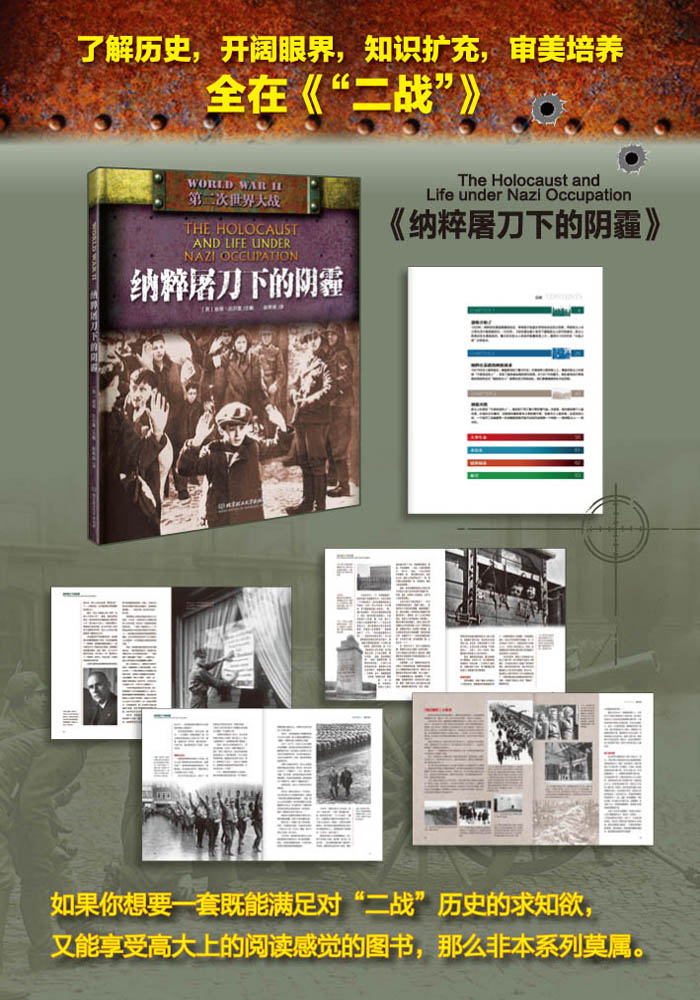 《纳粹屠刀下的阴霾》 着重阐述了“二战”中纳粹德国在战争期间对犹太人等被侵略民族进行的血腥屠杀,详实的图文将纳粹凶残的一面展现在读者面前,让读者对发起战争与屠杀的德国法西斯有更深刻的认识,同时引导读者意识到反法西斯战争胜利的来之不易和和平的宝贵。