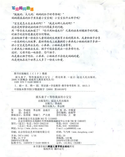 适用于0~3岁孩子:《摇头童子》系列丛书,是为0~3岁的婴幼儿量身订做的画册,可作为父母送给孩子的“人生第一本书”。父母把孩子带到这个世界,就有责任帮助他们从小养成良好习惯,引导他们坚实地迈出人生第一步。妈妈是孩子的第一任老师,“知性妈妈”造就“天才宝宝”。这套书,就是帮助父母正确教育、引导孩子的“教材、教案一本通”。