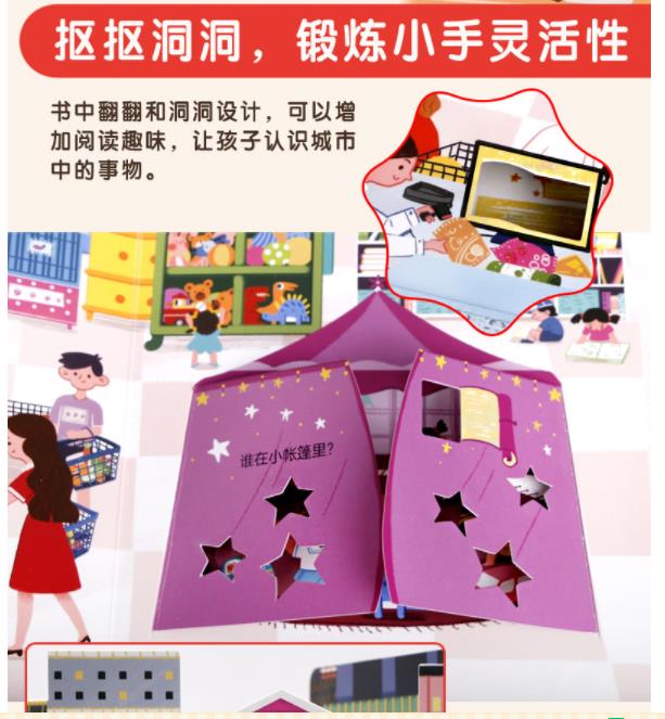 《城市》通过趣味翻翻的形式向孩子们展示了城市的代表性场景:车来车往的大马路、欢声笑语的游乐场、繁华热闹的中心广场……带领孩子认识城市的便捷和发达,感受城市的迷人和欢乐,发现城市的美好和有趣。