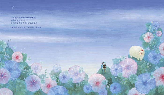 这只小绵羊告诉皮波,她能去梦里旅行。为了能找回丢失的梦,他请求和小绵羊一起出发。