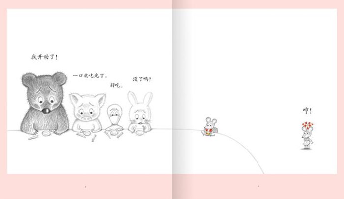 鼠小妹做了好吃的,请鼠小弟带朋友来吃饭。鼠小弟一下请来四个朋友,鼠小妹准备的饭菜不够了。“下次只能带一个。”鼠小妹说。可鼠小弟又请来的是个头大、饭量大的大象,饭菜又不够了。“下次带一个矮点儿的朋友!”鼠小妹又说。这次,鼠小弟会请来谁呢?
