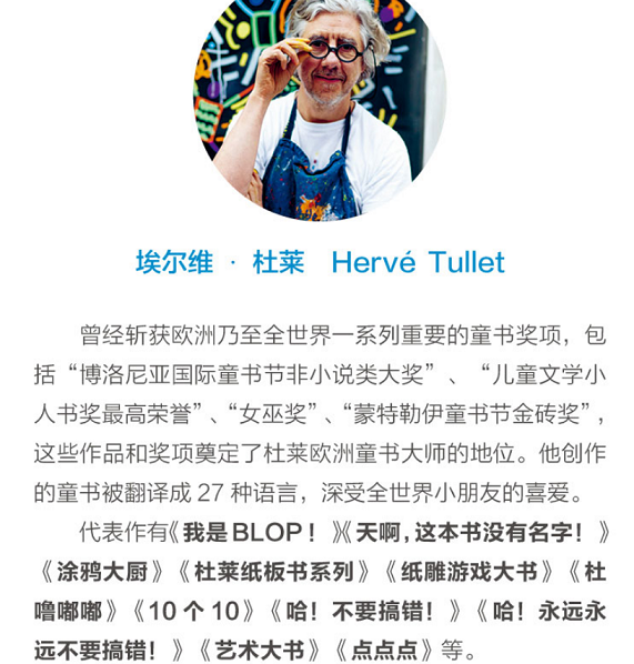 出版作品70 余部,所有作品都实现了文字、艺术和童心的完美融合,令人着迷的埃尔维·杜莱,已在全世界的儿童中间拥有了一批忠实粉丝。通过自己的工作坊,杜莱与读者们保持着特殊的联系,让人钦羡不已。