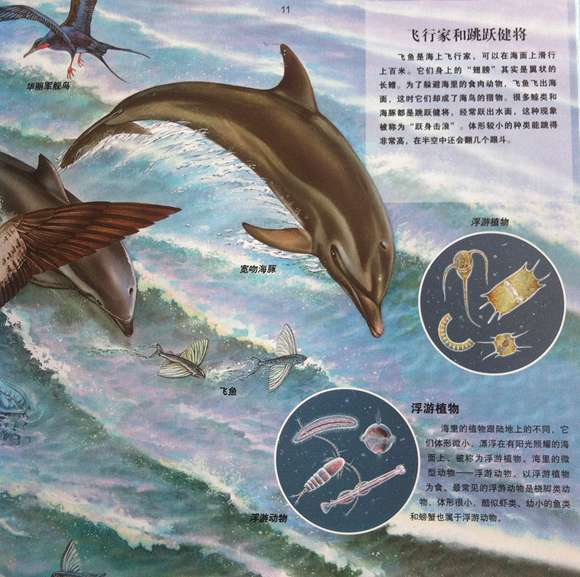 《美丽的海洋》:打开本书,一个神秘的水下世界将展现在你的眼前!书中有两个全景图,都超过一米长,并采用插图予以极详细的说明。一个展现海洋生活,从海面直至冰冻区,而深度直至海底。另一个介绍海洋巨兽,比如蓝鲸、大白鲨等,都进行了极其详尽的描述。