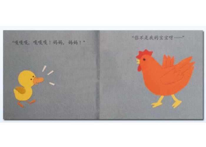 小黄鸭找不到妈妈了。哪个是我妈妈?是大黄狗?不像。是大黄猫?不像。是小兔子?不像。是什么呢?小牛在哪里?看到我妈妈吗?没有啊,大鹅在哪里?你是我妈妈吗?也不是。都不是,那我妈妈在哪里?哦,我看到了,那个是我妈妈。