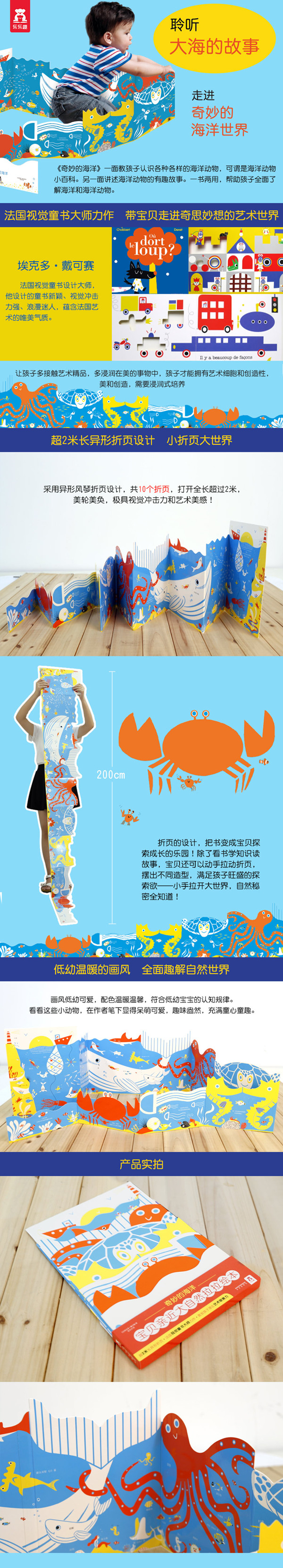 《宝贝亲近大自然拉拉绘本》采用异形风琴折页设计,共10个折页,打开全长超过2米,美轮美奂,极具视觉冲击力和艺术美感!