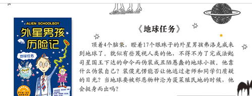 《外星男孩历险记》系列图书曾入围罗尔德·达尔幽默童书奖,该书语言诙谐幽默,情节跌宕起伏,想法天马行空。书中讲述了外星男孩奈杰尔和家人乘坐的宇宙飞船一路穿过82个星系,误打误撞地来到他们认为最丑陋星球——地球的故事。他们在地球上经历了一场难忘的冒险旅程,奈杰尔把在此发生的种种“遭遇”都写进了信里,他要告诉外星球的伙伴们