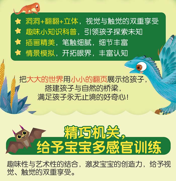 “揭秘小世界”系列是专为低幼儿童创作的“童眼看世界”认知绘本,旨在让孩子通过各种各样的创意”洞洞”和”翻翻”,看见自然、认识世界。此系列第二辑包含《动物园》《农场》《动物的家》《恐龙》和《夜晚》。多样主题、丰富内容和童趣插画,搭配孩子喜闻乐见的立体互动形式,充分激发和满足孩子的好奇心,锻炼孩子的手部精细动作,让孩子在戳洞洞、抠翻翻的游戏中探索自然世界的秘密!几乎所有的孩子都会经历一段”恐龙偏爱期”,书中各种各样的恐龙可以让孩子过足瘾。本书运用精巧的翻翻、洞洞设计,带领孩子走进直观立体的恐龙世界,探索充满刺激与神秘的恐龙世界。