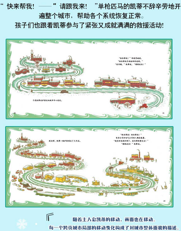 铲雪车凯蒂在城市的街道上活跃地开来开去。随着主人公的移动,画面也在移动。而这些介绍城市局部的移动变化的画面起到了描绘城市整体面貌的作用。伯顿的图画书的构成实在是多重的、立体的、极为精致的。