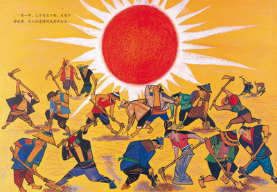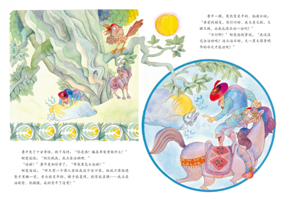 《神鹿》:这是一则甘肃地区的传说。每当沙漠风暴发生时,便会出现一只神鹿,指引人们脱离危险。一个曾被神鹿救过命的蛇医,竟然为了贪图赏赐,带领国王的人马来追杀神鹿……画者将敦煌壁画的表现法纳入画中,运用一大片一大片的强烈色彩,简洁有力地表现出古西域的奥秘与辉煌。画中人物即使在猛烈的动作中扭曲转动,轮廓依然那样稳固简洁。神鹿时而在眼前走动,时而远在天边静息,震撼与秩序达到舒徐有力的平衡。