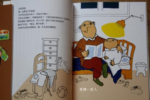 好爸爸给阿尔菲讲了一个很长的关于马的故事,道了晚安,但是阿尔菲还是不想睡。他试着找各种理由不睡觉:忘记刷牙、口渴了要喝水、想要小便、柜里有大狮子,要抱着玩具熊才睡。好爸爸被指挥得精疲力尽,最后躺在地板上打着呼噜睡着了。淘气的阿尔菲为爸爸盖上被子,自己回到房间也睡着了。