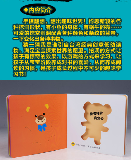 猜一猜我是谁引自台湾经典创意低幼读物,满足宝宝探索世界的愿望。书中透过简单的画面,以猜谜题的方式及挖洞的空间概念,让孩子来辨别与认知物体,可以训练孩子的逻辑思考与判断力。挖洞的方式让孩子有惊奇的效果,以游戏的方式来学习,让孩子从宝宝阶段养成对书的喜爱,从而养成阅读的习惯,是孩子成长过程中不可少的趣味学习书!