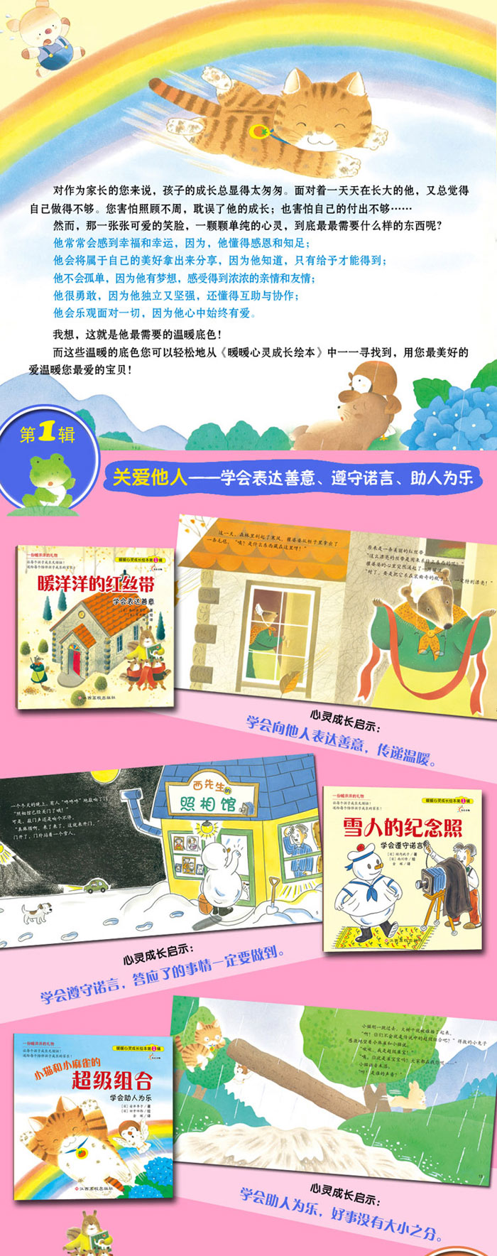 *《暖暖心灵成长绘本》是一套来自日本绘本名家历久弥新的经典之作,蕴蓄着童年成长的力量。这是来自内心的完美,是善良,是关爱,是勇敢,是智慧。它让你能感受到那一缕缕暖暖的阳光照进了心灵,让每一个孩子学会独立坚强、热爱生活、快乐成长,让每一个家长不再为孩子的成长而担忧!《暖暖心灵成长绘本》分3辑,共10册。每一个故事都是孩子成长心路历程的写照。读了这些故事的孩子会发现,长大真是一件很酷的事情!