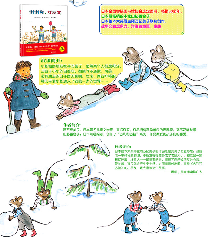 让我们从阿万纪美子所著的《谢谢你好朋友(精) 》中和孩子一起感受一下友谊的六大要素吧。这本给儿童阅读的绘本以友谊为中心线索,通过文图传递着爱心和勇气,对于儿童来说,获得友谊不难,维持和发展友谊才是难点,而解决诸如吵架这样的矛盾,需要他们*多地站在对方的角度看问题,这点尤其不容易。