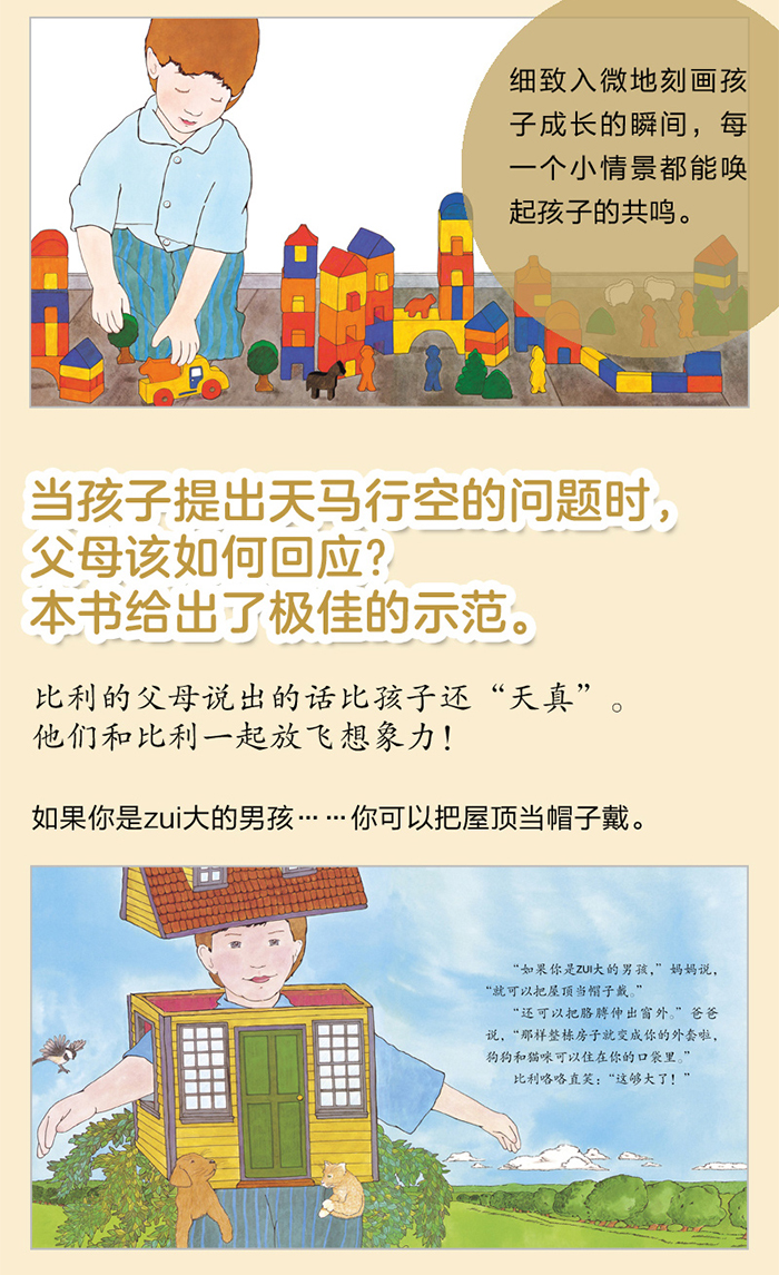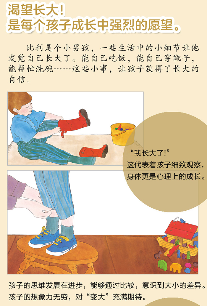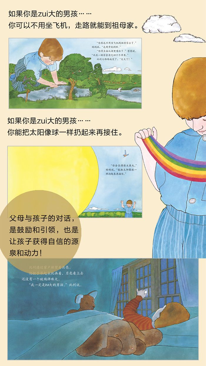 《我要长大!》是一个温馨的睡前故事绘本。父母如何倾听孩子内心的渴望,如何回应孩子的想象,这本书给出了不一样的答案。 比利是个小男孩,一些生活中的小细节让他发觉自己长大了。他想知道自己究竟可以长到多大,父母告诉他,他会越长越大,于是他幻想自己成为世界的男孩。如果成为的男孩会怎样呢?父母和比利之间展开了一场充满想象的对话…… 直到睡前告别仪式后,比利躺在舒适的床上,望着窗外,他发觉拇指和食指之间好像捏着一个大理石大小的月亮,在他的脑海里,他真成了那个的男孩。