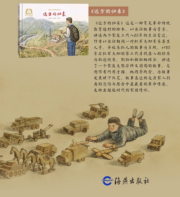 这是一种有关革命传统教育题材的绘本,以长征故事为背景,讲述两个家庭三代人80年的生活变迁。作者以长征期间一对红军夫妇寄养亲生儿子,并收养孤儿的故事为主线,以80年后红军夫妇的第三代寻找亲人的经历为叙述视角,倒叙和插叙相结合,讲述了一个家庭失散后终又团圆的故事。文图作者巧用手镯、地图等线索,为故事发展埋下伏笔。故事表达的是在家人别离的悲伤与思念中蕴藏着的革命情感,反映出超越时代的家国情怀。