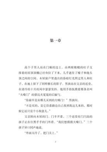“没有哪条狗能比得上大嗓门。”男孩说。可是,父亲并没有接他的话。男孩希望他能接着说说大嗓门,但他只是一言不发、一动不动地站在那里。从小木屋窗户里投出的昏暗灯光形成了一个圈,将黑暗挡在外围,但到了木屋的拐角,那光圈也就消失了。父亲的目光穿过光圈的边缘望向远处。他似乎在听男孩说话,却没有回答他。
