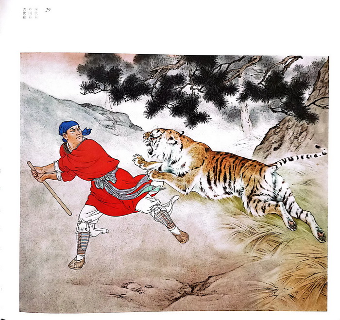 这是《水浒传》里一个脍炙人口的故事。话说武松告别了柴进,在回清河县的路上,于一个酒店里连喝了十八碗酒。店主告诉他,这酒喝三碗就醉得过不了景阳冈,何况景阳冈上有老虎,常出来伤人,劝他住一夜再走。武松不信,踉踉跄跄地上了冈,果遇猛虎。那虎连使三招没能抓住武松。武松举哨棒就打,却打在了树上,哨棒断成两截。他索性抓住老虎的顶花皮'直打得老虎七窍流血,气绝身亡。