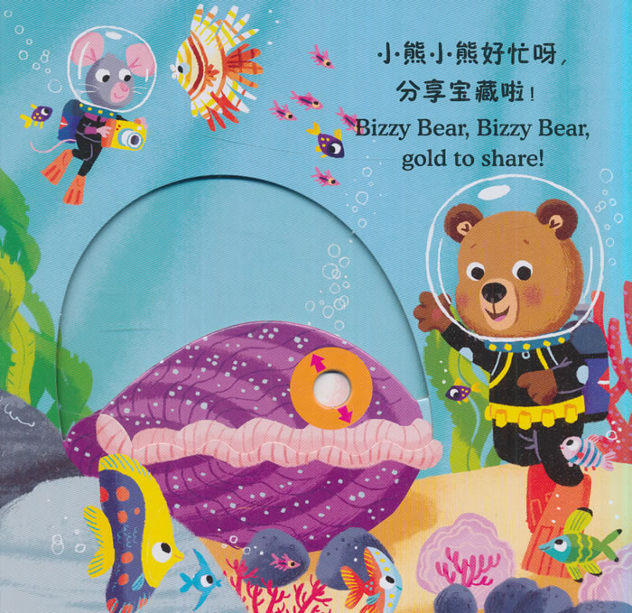 在一册中,忙碌的小熊乘坐潜水艇来到了大海深处,小朋友可以推推、拉拉、转转厚纸板操作页,帮助潜水艇潜入大深海,转动转盘就能让小熊看到窗外壮观的海底世界,你能发现多少种海洋生物呢?原来当潜水员是如此有趣!