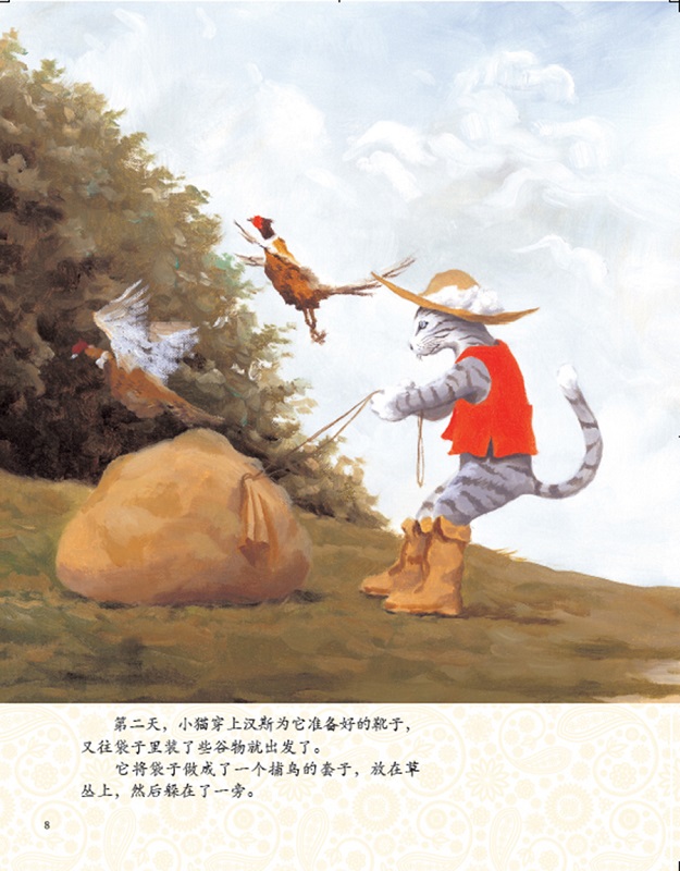 村子里,住着磨坊主人和他的三个儿子。 磨坊主人去世时,留给三个儿子一些遗产。 在城堡里那个邪恶的魔法师的主持下,大儿子得到了水磨坊,二儿子得到了一头驴。 可是,小儿子汉斯只得到了一只小猫。 “哎!以后的日子可怎么过呀?” 汉斯十分发愁,坐在那里默默地流泪。 这时,他听见小猫开口说话了: “主人,主人!你别哭,我会帮助你的。 不过我需要有一双靴子和一个大口袋。” 第二天,小猫穿上汉斯为它准备好的靴子,又往袋子里装了些谷物就出发了。 它将袋子做成了一个捕鸟的套子,放在草丛上,然后躲在了一旁。 不一会儿,飞来了好多野山鸡,它们一个个钻进了袋子里。 “哈哈!来得正好!” 小猫跑过去把袋子口上的绳子使劲儿一拉,就把袋子扎紧了。 它拿着袋子去了王宫,对国王说道:“尊敬的陛下!这是我家主人卡罗巴斯伯爵献给您的礼物!” “哦,是野山鸡,真是太好了!” 国王显然非常高兴。 “来人呀,赏给这只猫咪一袋金币!” 小猫每天都去抓野山鸡送给国王。 有一天,它对国王说道:“尊敬的陛下,我的主人卡罗巴斯伯爵说,如果有机会他很想见见您!” “哦,是吗?我也很想见见他。” 国王对这个卡罗巴斯伯爵很感兴趣。 这天,国王带着公主到湖边游玩。 小猫赶紧跑回家对汉斯说道:“主人!快脱掉衣服,跳进湖里去!” 汉斯赶紧把衣服都脱掉,“扑通”一声跳进了水里。 小猫过去把衣服都藏了起来。 这时,国王的马车过来了。 小猫跑到马车前对国王哭诉道:“尊敬的陛下,我的主人卡罗巴斯伯爵在游泳时,衣服被人偷走了,请您帮帮忙吧!” 国王一听,对手下人说道:“来人啊,把我的衣服拿来给卡罗巴斯伯爵穿上吧!” 这下,汉斯穿上了国王的衣服,简直就像个王子一样气度非凡。 公主看到了,心里也很喜欢。 “卡罗巴斯伯爵!很感谢你送给我的野山鸡。” 国王很高兴见到他。 可这时却不见了小猫的踪影,它去哪里了呢? 原来,小猫早就告诉汉斯,让他把国王带到魔法师的城堡里去。而小猫早在他们之前就赶到了那里。 它对着田里为魔法师耕作的人们说道:“乡亲们,如果国王问这些田地是谁的,你们就说是卡罗巴斯伯爵的!” 接着,它又急匆匆地跑向丛林,对着那些在丛林里为魔法师工作的樵夫说道:“乡亲们,如果国王问这些丛林是谁的,你们就说是卡罗巴斯伯爵的!” 乡亲们早就恨透了那个邪恶的魔法师,就都答应了。 然后,小猫又找到了魔法师,对他说道:“魔法师先生,我的主人卡罗巴斯伯爵马上过来,他是来给您物的。” “哦?是吗?” “我听说您的法力高强,能变任何动物。那么,您能变成一头雄狮吗?” “哈哈!这有什么。” 说着,魔法师“嘭”的一声变成了一只威武的大狮子。 一瞬间,魔法师又恢复了原样。 “哇,好厉害呀!那么,您肯定也能变成一只小老鼠喽?”小猫假装很惊讶,对魔法师说道。 “嗨!那太容易了 ! 看好了!” “嘭”的一声,魔法师变成了一只小老鼠。 小猫上前一把抓住老鼠吞进了肚子里。 这时,国王的马车经过一片广阔的田地和茂密的丛林。 “这里都是谁的啊?” 每次他都听到人们回答说:“是卡罗巴斯伯爵的。” “哦,卡罗巴斯伯爵真富有啊!” 后,国王的马车来到了城堡前。 正在演奏迎宾曲的小猫赶紧迎上前,毕恭毕敬地说道:“尊敬的陛下,欢迎您来到卡罗巴斯伯爵的城堡!” “哦,这座城堡真漂亮啊!” 国王觉得很满意,于是把公主嫁给了汉斯。 穿靴子的小猫呢?变成了大臣。 他们一起在城堡里过着幸福的生活。
