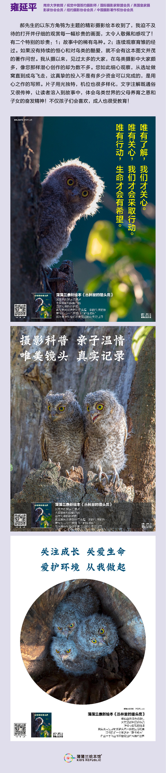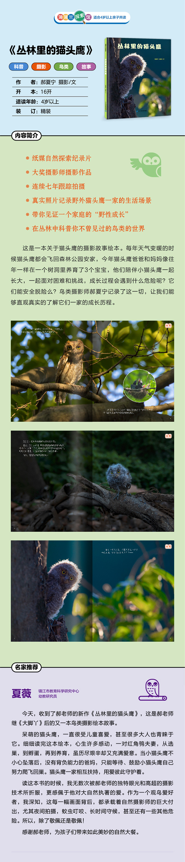 这是一本关于猫头鹰的摄影故事绘本。每年天气变暖的时候猫头鹰都会飞回森林公园安家,今年猫头鹰爸爸和妈妈像往年一样在一个树洞里养育了3个宝宝,他们陪伴小猫头鹰一起长大,一起面对困难和挑战,成长过程会遇到什么危险呢?它们能安全脱险么?鸟类摄影师郝夏宁记录了这一切,让我们能够直观真实的了解它们一家的成长历程。