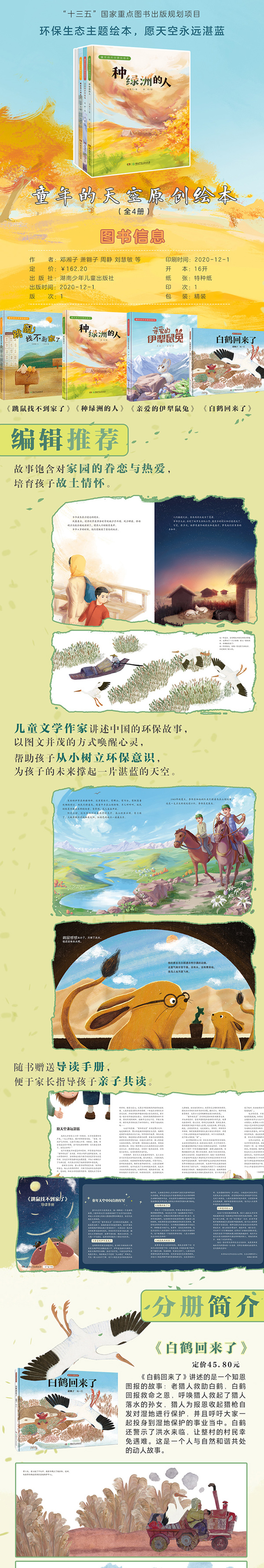 《白鹤回来了》:铺开一个知恩图报的故事:老猎人救助白鹤,白鹤回报救命之恩,警示洪水来临,救助了村庄里的村民,*终以当地为家,永远驻留在水乡,成就一段自然佳话
