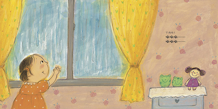 小女孩在雨天,穿上雨衣和雨靴,撑起雨伞,漫步在雨天的院子里。?通过观察和聆听雨滴滴落在不同事物上的样子和声音,来认识并熟悉下雨这一自然现象。?故事不同于以往的叙述形式,而是采用诗歌来描写雨的发生和落下。美好的语言体现出 人?与自然的关系,让孩子通过接触和体验,表达身体感受