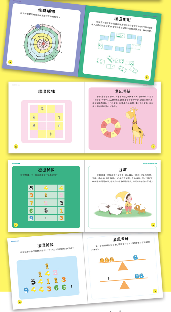 《逗逗脑》全书共六册,题材由易到难,包括迷宫谜题、数独谜题、天平平衡谜题、找不同谜题。推理谜题、图形谜题、记忆谜题等,从而提升专注力、逻辑思维、分析、推理、创造、观察能力等。
