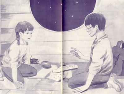 她把小豆子抱起来。杰克捡起那本打开的书。