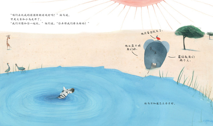 斑马有两个形影不离的朋友,大象和小鸟。有一天,因为斑马跑得太快,朋友们疏远了他。直到暴风雨来临,大家才发现,原来朋友间是互相需要的……作者用简单又暖意融融的故事,让我们懂得了朋友意味着什么,明白了换位思考、包容、接纳和分享会让友谊更美好。