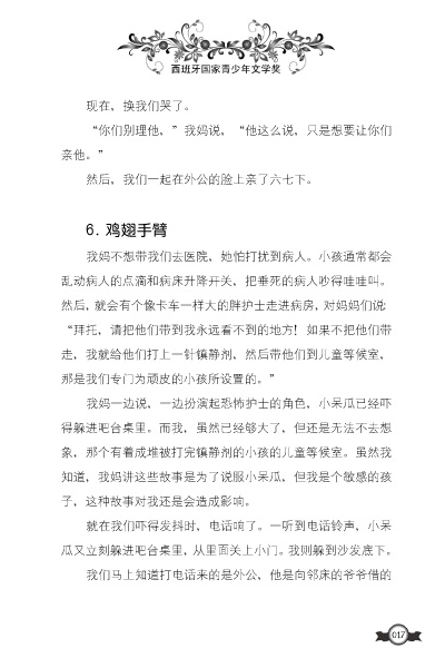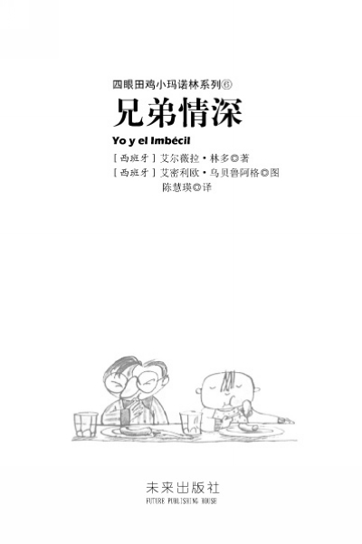 曾获1998年西班牙国家青少年文学奖。《小玛诺林系列》是一套具有浓郁生活气息的儿童读物,讲述了男孩小玛诺林8到10岁的生活。而第6本《兄弟情深》讲述的是外公决定到医院动手术,妈妈必须放下家里工作,到医院照顾他。妈妈请邻居露易莎来照顾他们。露易莎带他们买衣服,前往贝纳博的工厂,吃大餐……兄弟趁露易莎不在,在家玩“兽医游戏”,结果搞得一团糟,让露易莎大为生气。露易莎和妈妈又赌气了,小玛诺林和小呆瓜为了使她们重归于好,在外公的指导下,又有什么出奇制胜的举动呢?