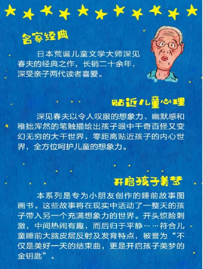 该系列是日本绘本大师深见春夫的睡前故事绘本系列,包含5个温馨有趣的小故事,故事情节有趣活泼,很有游戏性,画风想象力丰富,色彩明丽,造型可爱有趣,非常复合幼儿心理特点和审美趣味。是一套激发幼儿想象力和创造力的游戏绘本,适合3-6岁儿童阅读。 树洞里飞出一个小妖怪。他飞过菜地,穿过蛋糕店,召集了所有的小妖怪们。大家相约到一所房子里去,并给房子里的棉花糖妖怪画了一张脸。可是这时候来了一台大吸尘器,把小妖怪们一个个都吸了进去......小妖怪们能逃出来吗?