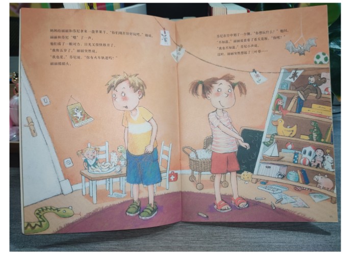 丽丽在幼儿园里碰到了小男孩芬尼,他们很谈得来,一块儿寻找漂亮的三叶草,玩得很开心。丽丽就只想跟芬尼玩,还邀请芬尼到她家玩。为了表示自己的喜爱,丽丽在大热天也穿上了有三叶草图案的红毛衣去上学。但是,当她和芬尼手牵手一起郊游走在同学最前面时,招来了周围同学恶意的嘲笑,幸好善良而聪明的乌拉老师说,这很好呀!还拉着丽丽一块儿走。然而,芬尼害羞并且害怕了,他站在了其他同学的中间,与丽丽划分了界限。丽丽很伤心。快过生日了,丽丽邀请了所有的同学,除了芬尼。傍晚时分,丽丽家的门铃响了,丽丽去开门,看见芬尼手捧着一个蛋糕,这是芬尼特地为她做的,上面还有一棵杏仁泥做的四叶草…… 典型的两小无猜。同时,这个故事也给家长带来一些思考。