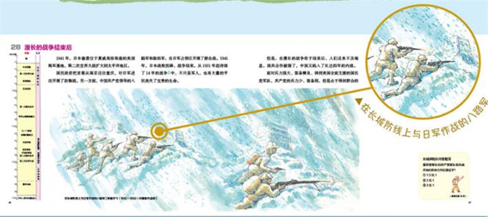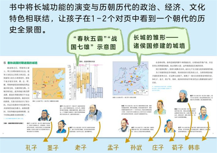本书从准备到创作完成花费了近35年时间,光是页面的布局就构思了数年。书中以长城的修建为线索,将长城功能的演变与历代的政治、经济、文化特色相联结,让孩子在1-2个对页中看到一个朝代的历史全景图。