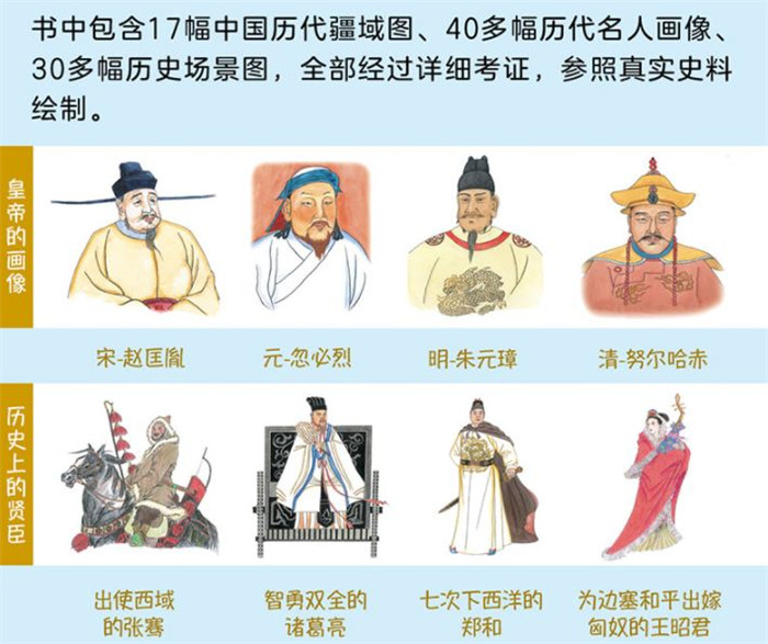 书中包含17幅中国历代疆域图、40多幅历代名人(帝王、贤臣、文人、科学家等)画像、30多幅重要事件场景图,使丰富的历史知识得到直观化呈现。所有插图都经过详细考证,参照真实史料绘制而成。