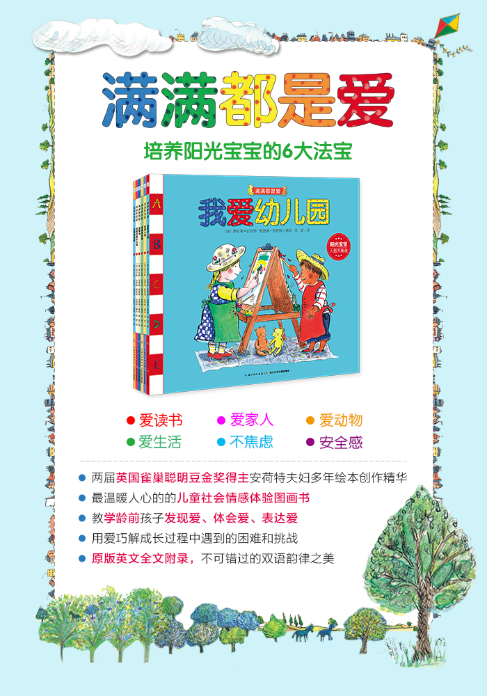 《满满都是爱》是一套针对年龄段为0-6岁儿童的情感启蒙书,全书6册,讲述了小主人公们和家人、宠物、书本、家庭生活、玩偶的美好关系。由英国著名童书作家夫妇罗伦斯安荷特与凯瑟琳安荷特一同创作。全套都由优美温暖的图画构成,其主旨是让孩子发现身边的爱,体验身边的爱,并且学会表达爱,在充满爱的环境里当一个性格健全的阳光宝宝。全书同时保留英语原文,让小朋友在和爸妈一起温馨地阅读中文故事的时候也能体会到英语原文的语言美感。