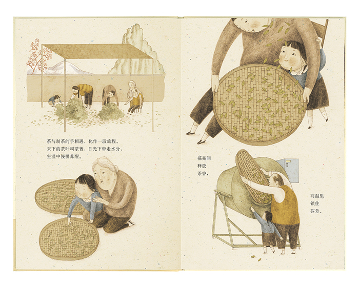 在一座宁静的山中,有个小女孩穿梭在家族茶园,引领读者观看采茶的过程:茶叶从树上被摘取下来、在日光下曝晒发酵、揉捻出香气、再干燥去除水分的过程。