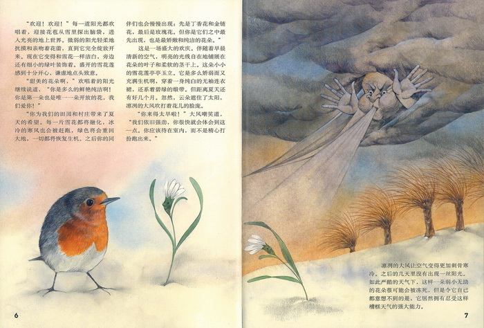 雪花莲的种子埋藏在厚厚的积雪下面,潮湿和阴冷包围着它。雪花莲渴望着阳光的拥抱,奋力向上生长,冲出阴暗的世界,却遭遇了寒冷的冬天。纵使风雪压垮了它的枝头,却依然追寻着心中温暖的夏日阳光。