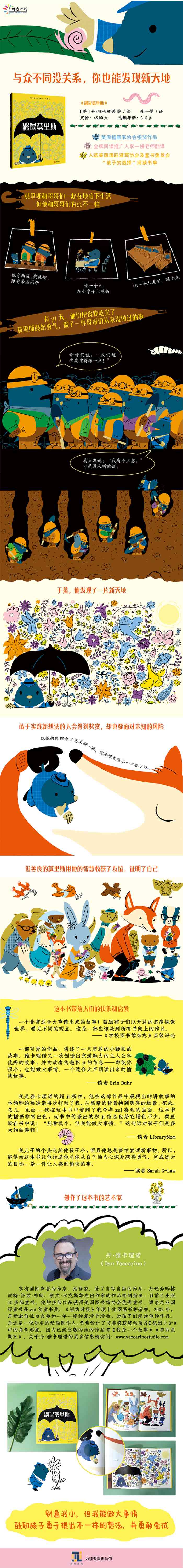 【编辑推荐】 ★与众不同没关系,你也能发现新天地 ★鼓励孩子勇于提出不一样的想法,并勇敢尝试 ★美国插画家协会银奖作品 ★《纽约时报》年度十佳图画书作者创作 ★入选美国国际读写协会及童书委员会(ILA/CBC)“孩子的选择”阅读书单 ★很多时候孩子会觉得自己和其他人格格不入,但一点点的勇气就可以让他们踏上实现自我的旅程 ★生动地呈现了一个从来不被倾听的小不点用自己的行动改变自己处境的有趣过程 ★金牌阅读推广人、童书创作者、翻译者李一慢老师翻译 【内容简介】 莫里斯和哥哥们一起在地底下生活,但他总是有点不一样。他穿西装、戴礼帽,随身带着雨伞,一个人在小桌子上吃饭,一个人睡小床,一个人看书。当他们吃光了食物,哥哥们决定往更深的地底挖时,莫里斯鼓起勇气,做了一件哥哥们从来没做过的事…… 国际知名作家、插画家丹·雅卡理诺用富有节奏的语言和风格鲜明的插画讲述了...