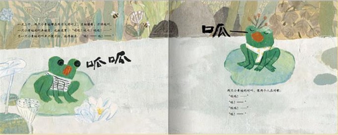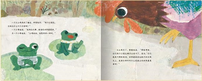 鱼塘里有两只小青蛙,一天它们不停“呱呱”地叫着,比比谁是世界最高音。接下来,- 只大公鸡、-只老白鸭、一头毛驴、一队吹唢呐的人和一艘响着汽笛的轮船,先后加入了比赛,不断发出更高更大的声音。最后,两只小青蛙终于明白,无论高还是低、大还是小,每种声音都是这个世界上独一无二的声音。
