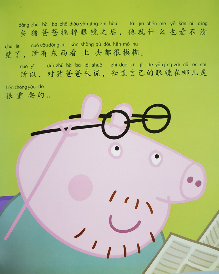 本书为“小猪佩奇心理成长故事书(注音版)·我有好习惯”中的一册,教育孩子要养成整理物品的好习惯。一天,猪爸爸找不到了自己的眼镜,没了眼镜,他什么都看不清楚。佩奇和乔治主动帮猪爸爸找眼镜,他们在客厅、浴室、卧室等地方找遍了,可是都没有找到。最后,猪爸爸从沙发上站起来后,发现眼镜一直被他坐在身下。