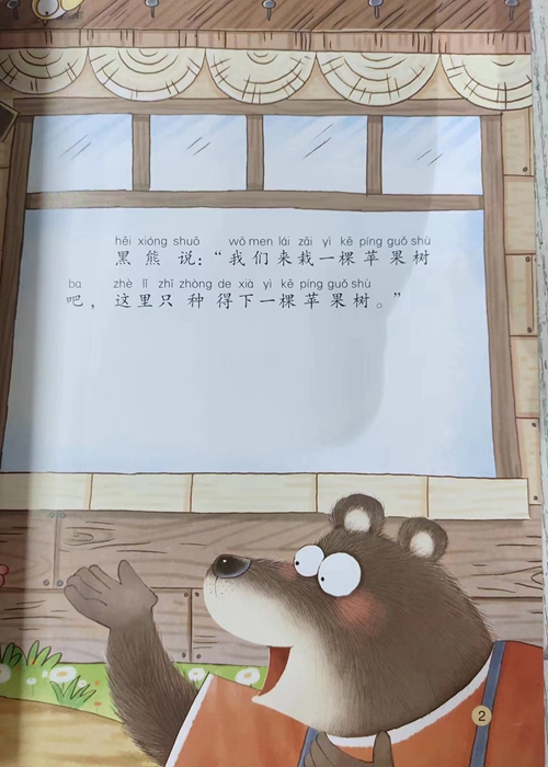 黑熊和狮子一趣种果树,一起赏花,闻花霜,"最后他们一起分享唯一一个菜分享的果实,真美味啊