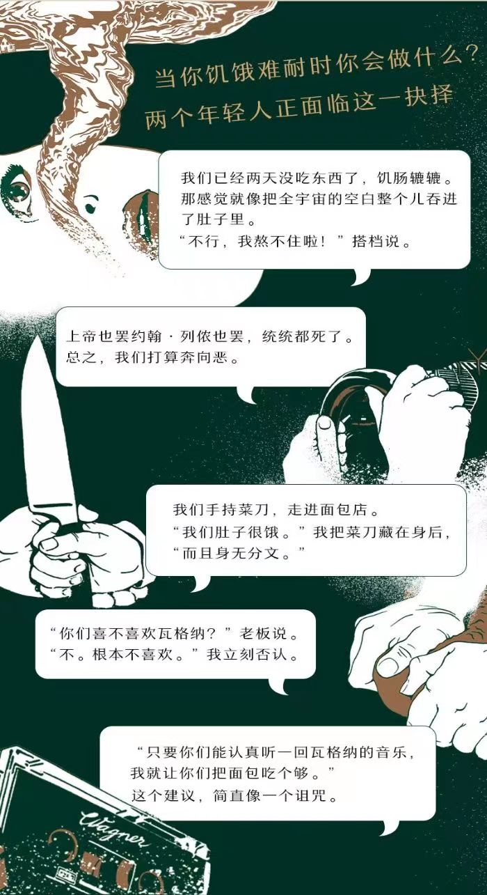 两个游手好闲的年轻人饥肠辘辘。然而,这不是普通的饥饿,感觉像把全宇宙的空白整个儿吞进了肚子里。上帝也罢约翰.列侬也罢,统统都死了。这么一想,似乎一切都可以豁出去了。为了填饱肚子,他们拿着菜刀,准备袭击一家面包店。面包店老板却提出了一个古怪的要求:"只要你们认认真真听一回瓦格纳的音乐,店里的面包可以让你们吃个够。"