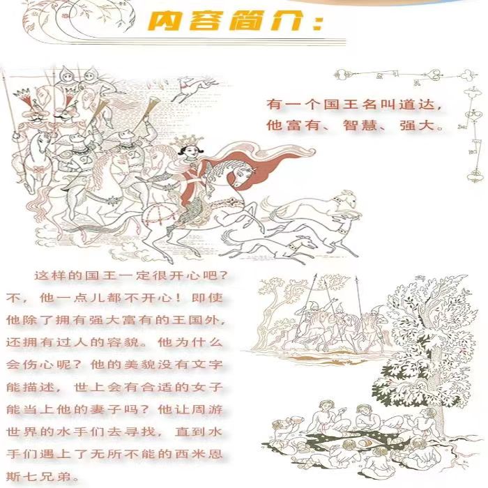 有一个国王名叫道达,他富有、智慧、强大。 这样的国王一定很开心吧?不,他一点儿都不开心!即使他除了拥有强大富有的王国外,还拥有过人的容貌。他为什么会伤心呢?他的美貌没有文字能描述,世上会有合适的女子能当上他的妻子吗?他让周游世界的水手们去寻找,直到水手们遇上了无所不能的西米恩斯七兄弟。 七兄弟又机智又勇敢,他们能为国王找到心仪的爱人吗?
