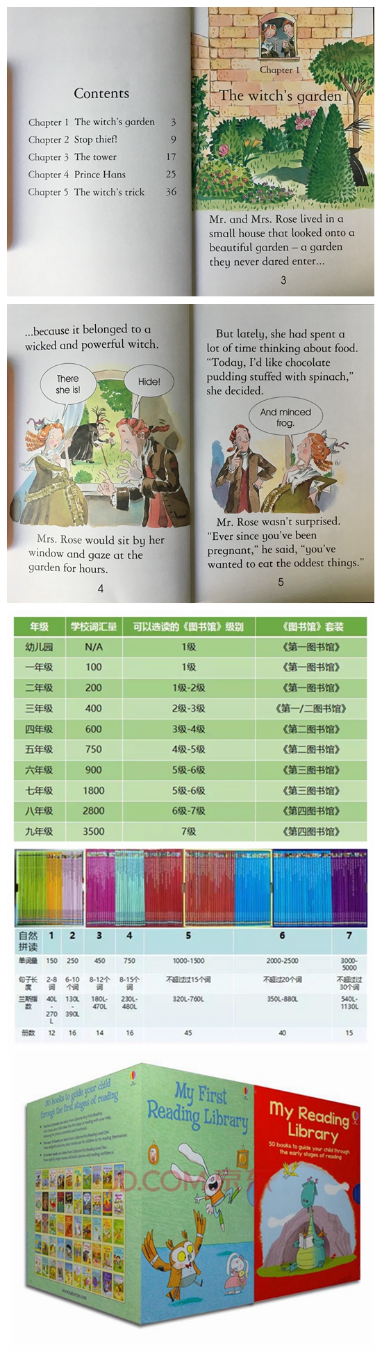 USBORNE图书馆系列到LEVEL5之后,词汇量增加到1000-1500,每页的文字数量在十行左右,共48页,涵盖了英文大部分的语态和时态。从这个级别开始,由图画书逐渐过渡到章节阅读。适合小学五六年级和初中生作为词汇量扩展读本。Level5系列均为世界知名的民间故事和童话故事,学生一般都已接触过中文版本。