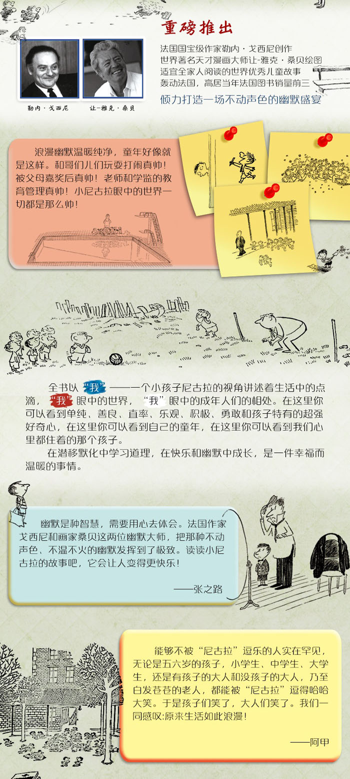 尼古拉的淘气、调皮、没有恶意的“恶作剧”,独出心裁的“捣乱”,让你觉得这个清澈如水、童趣盎然、好奇心无处不在的男孩子就是你的亲人。他对事物、人物的认识,独特的思维方式、行为准则和心理活动,符合他的个性又引人深思。这是一位有深邃哲思和人生领悟却又童心满怀的作家,从孩子的视角观察世界又出离浮丽,以孩子的话语而又上升到优美的文学语言写出的棒极了的小说。 ——苏叔阳 读而思之,孩子们会感到,尼古拉仿佛就在他们中间,童声童气地描绘着他的让人忍俊不禁的生活趣事,使他们读得入迷,笑得开心。 ——浦漫汀 这部作品有着奇巧的构思、生动的情节、有趣的人物形象,不管哪个国家、哪个民族的读者在它面前都会受到幽默的感染,情不自禁地发出笑声。 ——缪印堂 幽默是种智慧,需要用心去体会。法国作家戈西尼和画家桑贝这两位幽默大师,把那种不动声色、不温不火的幽默发挥到了极致。读读小尼古拉的故事吧,它会让人变得更快乐!