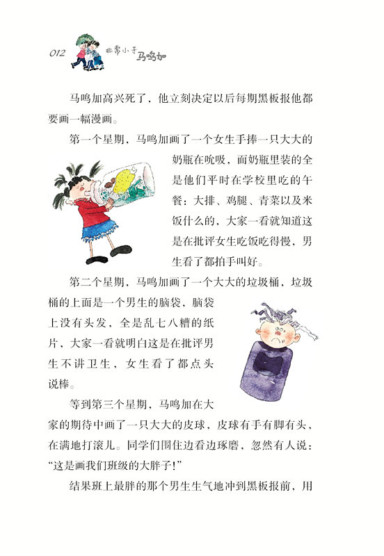 “丁转转有短处的,他爱和男生玩,不和我们女生玩!”一个女生站起来回头看着马鸣加驳斥道。马鸣加立刻发出“啊”一声,意思是:你还好意思说?男生当然只跟男生玩,女生会踢足球吗?女生会爬树吗?真是的!