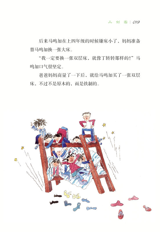 《非常小子马鸣加5:三剑客》包括《三“贱”客》《漫画大王》《一张好玩的双人床》《好朋友转学了》等。在《宇宙飞“瓶”》故事里,马鸣加的叔叔送给马鸣加一个水瓶,它是用制造宇宙飞船的材料制成的,庄纯纯幽默地称它为宇宙飞“瓶”。马鸣加每天早晨都不会忘记往里面装各种各样的饮料,他觉得只有这样才能对得起这样一个了不起的水瓶。可是一个月之后,马鸣加得了蛀牙!他整天抱住自己的嘴,而那只宇宙飞瓶终于不见了。庄纯纯问马鸣加:“你是几点几分几秒发射的宇宙飞‘瓶’的?”同学们大笑起来,只有马鸣加没有跟着一起笑。