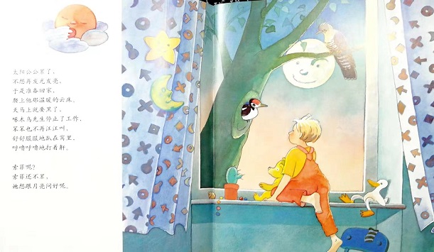 索菲还不想上床睡觉。月亮还醒着,讲着各种动听的故事。猫咪们也在索菲的房间里玩起了捉迷藏,只有小狗笨笨已经困得睡着了。幸好最后瞌睡精灵出现了,他为索菲和大家带来了最美最甜的好梦。