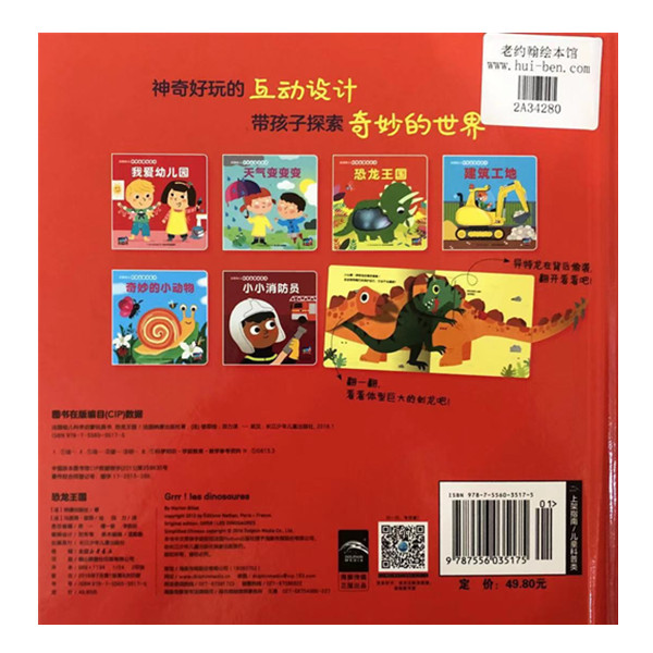 本书包含六大科普主题:恐龙、天气、小动物、建筑工地、消防员和幼儿园。《天气变变变》:在太阳光底下,该怎样保护自己呢?暴风雨要来了,让我们看看暴风雨来时的景象吧!雨停了,天空出现了彩虹,你知道彩虹有哪几种颜色吗?《我爱幼儿园》:爸爸妈妈把宝贝们送到了幼儿园,他们要在幼儿园里开始一天的生活:上课、玩耍、吃午饭、睡午觉……《小小消防员》:丁香街失火了,火警电话响起之后,小小消防员要迅速穿戴好装备,检查好消防车设备,然后立即赶往火灾现场。《建筑工地》:挖掘机推倒了老城区的房子,巨大的起重机吊起装备,卡车运来了满满一车黄沙,压路机使劲碾压着路面……你会看到和建筑工地有关的一切。《奇妙的小动物》:介绍了各种小动物,如蚱蜢利用它的大长腿能跳得很远,蜜蜂将采好的花蜜带回蜂巢,蚂蚁把食物放在安全的地方……《恐龙王国》:介绍了各种不同类型的恐龙,它们的特征以及生活习性等,如秀颌龙是*小的恐龙之一,大概和鸡差不多大。